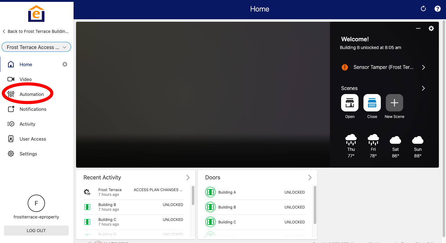 1. Login to PointCentral or alarm.com and go to to the Building Access Enterprise Group, then select the account below it for the individual system