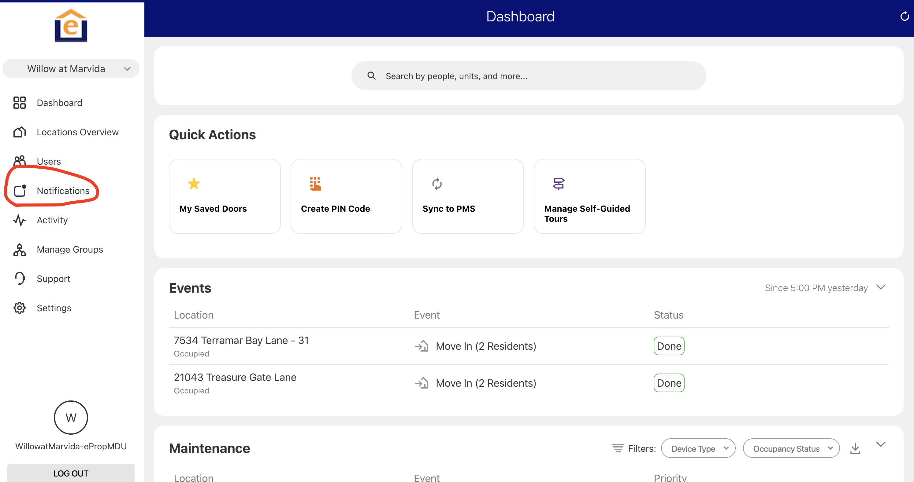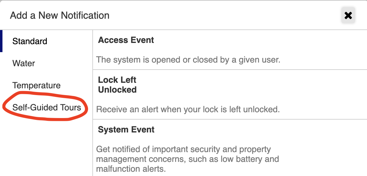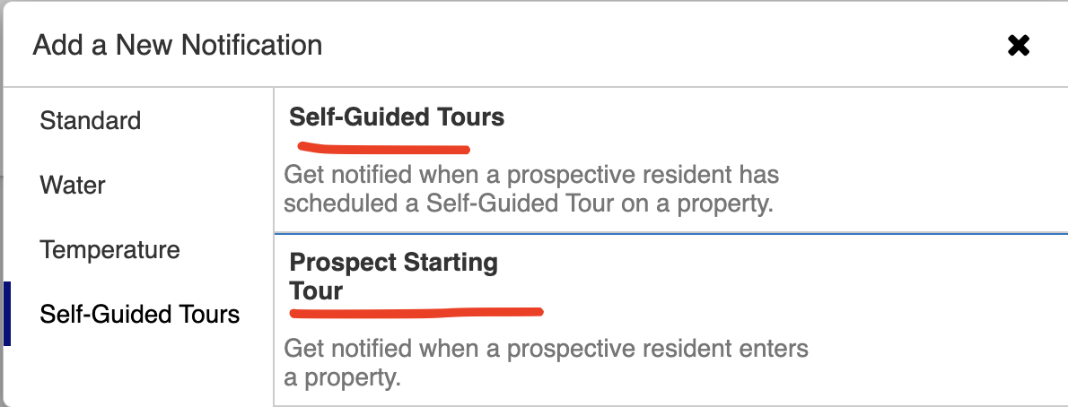 3. Then click "self-guided tours" to create a notification for when a tour is booked, or click "prospect starting" to get an alert when the prospect uses their code at the property.