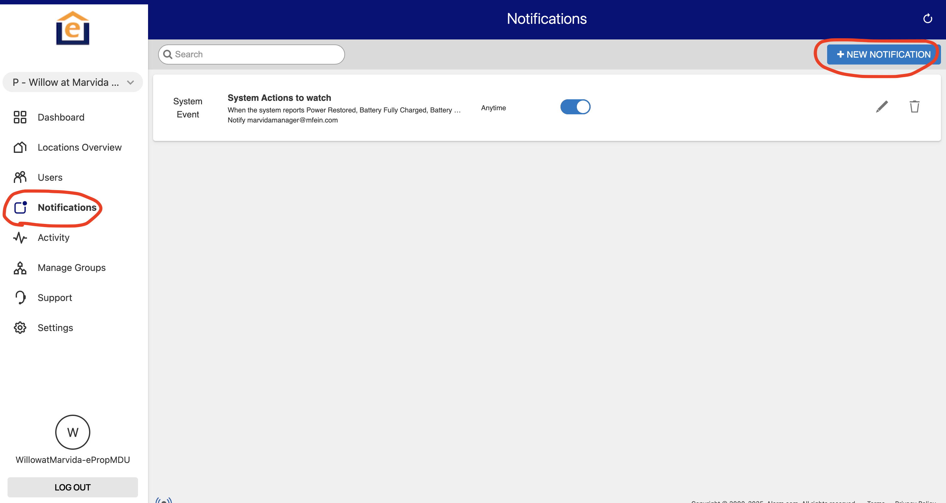 2. Then click "New Notification" in the top right, and select "Self-Guided Tours" from the menu