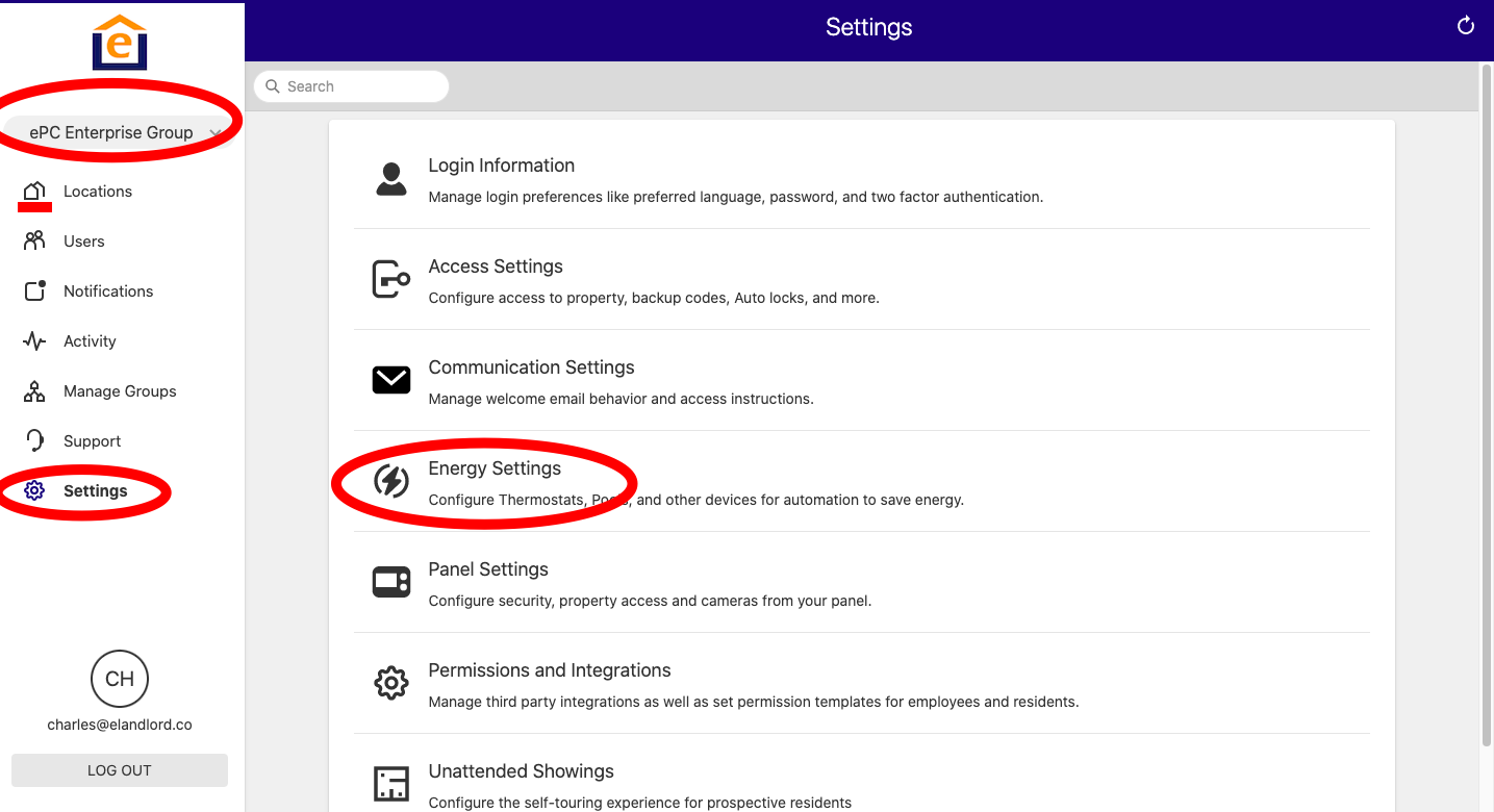 1) Login to the Enterprise Account (note the two buildings side by side - this indicates you're at the Enterprise level), click "Settings" on left menu, then click "Energy Settings"